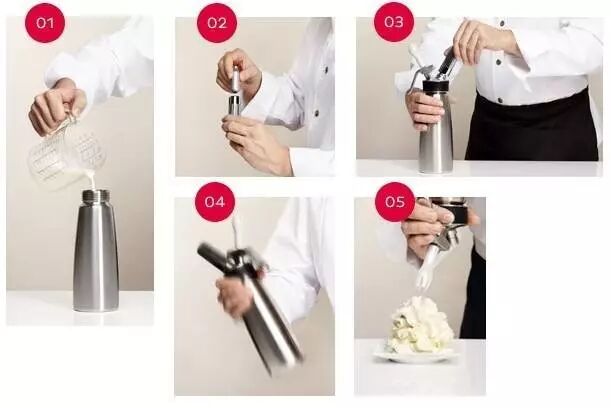 气弹在使用的时候需要配合一个奶油枪,它长得像保温杯,上面有两个突出的部位,一个用来安装气弹,一个用来挤出奶油,其原理和泡沫状的摩丝是类似的。如果有兴趣,你可以在咖啡店仔细找一下,操作台上肯定有这个东西的。