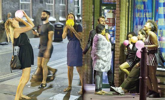 笑气可以带来一定的欣快感,成瘾性不强,因此在欧美年轻人群体中逐渐流行。常见的形式是充入气球吸食(俗称吹气球),也有直接用奶油枪吸食的,多者一晚上吸入几十甚至几百个气弹。近年来,这一趋势已传入国内,本该用于制作奶油的笑气弹在一些夜场和酒吧暗地交易。