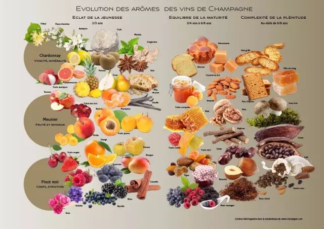 随着陈酿时间的增长,香槟于酵母残渣接触越多,香气也越发复杂丰富。陈酿时间较短的香槟,其香槟以清爽的果香,花香为主。而陈酿越长的香槟,越发展现出酵母酒渣所特有的可可,饼干,咖啡等成熟气息。