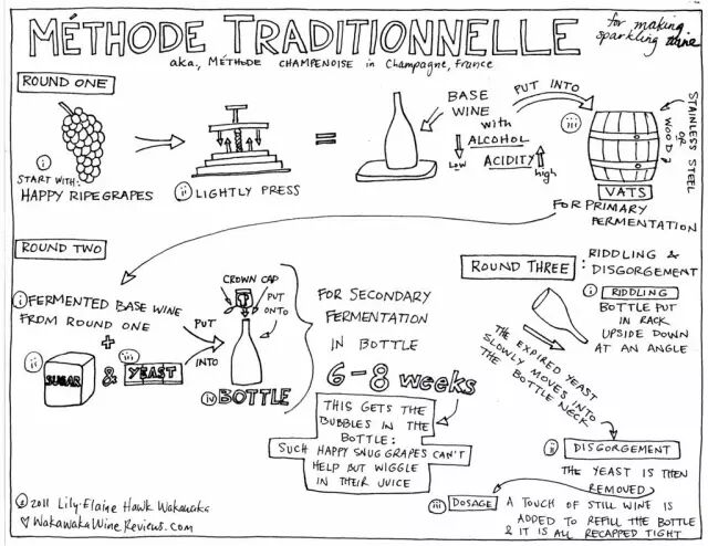 采收——> 压榨 ——> 澄清——> 酒精发酵——> (可选:苹果酸乳酸发酵)——> 陈放——> 混酿——> 装瓶——> 加糖和酵母引发二次发酵——> 瓶中陈酿——> 转瓶——> 除渣——> 加糖——> 包装——> 上市