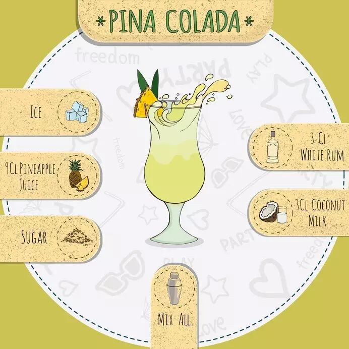 30ml白朗姆酒,30ml椰奶,90ml菠萝汁,糖,冰块