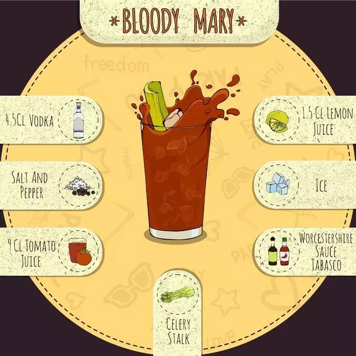取一古典杯,加入冰块,依次倒入伏特加、番茄汁、柠檬汁、及其它配料(根据自己喜欢的口味取舍)。直调法,最后用芹菜杆装饰。