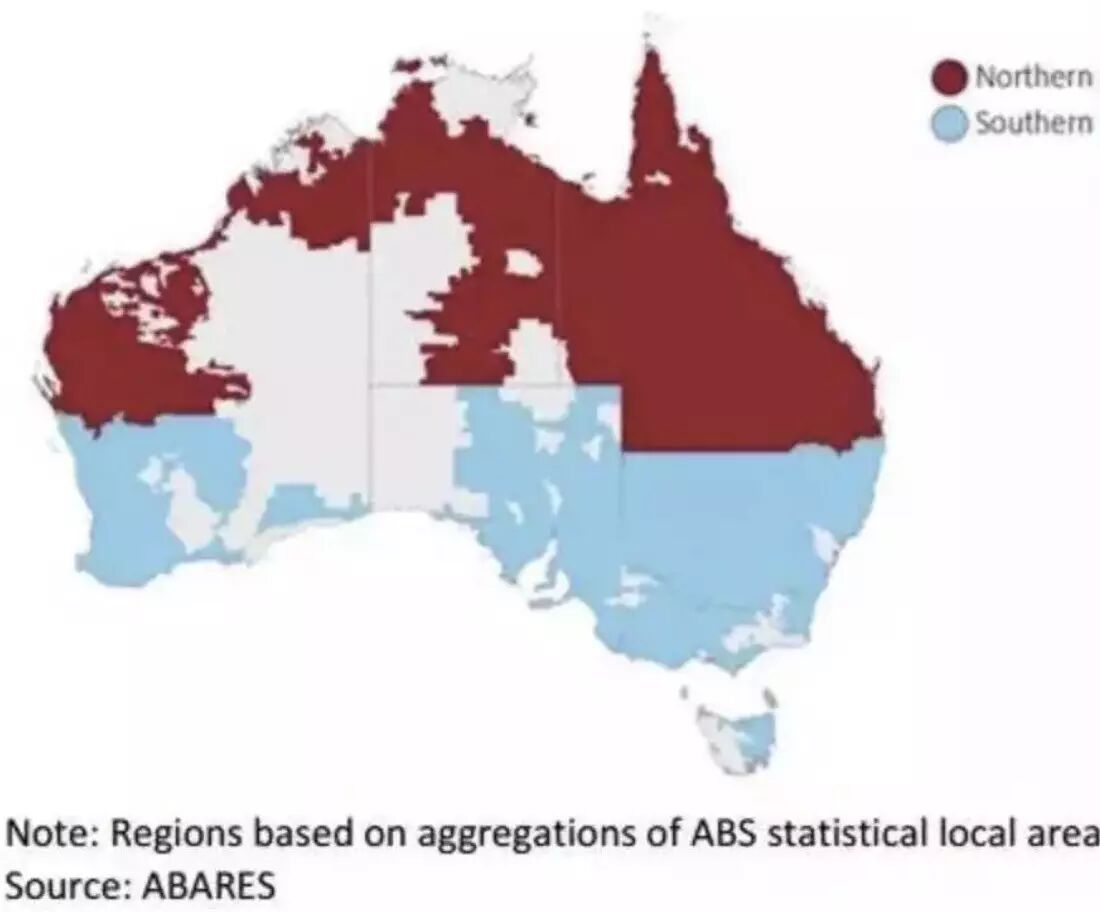 澳洲牛肉养殖分两大产区,牧场规模较大的北部地区(包括昆州、北领地以及西澳州北部)和多为小规模农场的南部地区(西澳州南部、南澳、新州、维州与塔斯马尼亚、其余地带)。