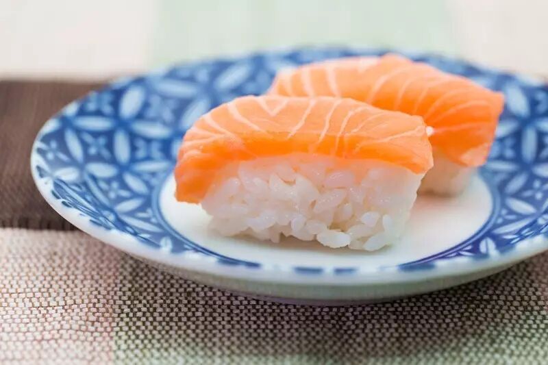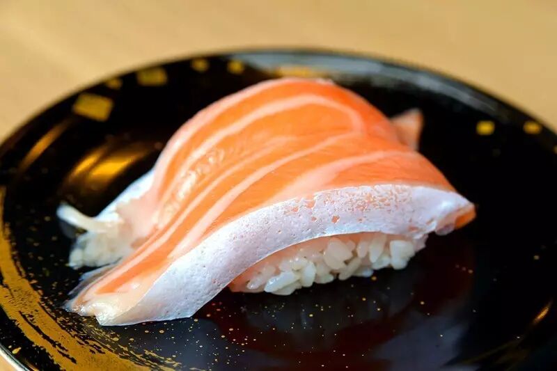 回转寿司店的三文鱼握寿司。图:123rf.com.cn正版图片库