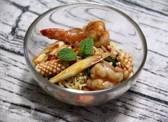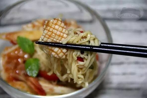 当然,如果加多一点料,则会有更豪华的呈现——比如这样子的泰式风味酸辣海鲜泡面沙拉~