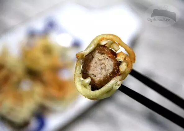 将面条裹在丸子外面用四成热的油炸至定型后捞出,将油温升至七成再次复炸即可盛出(这里选择炸酱面因为其面条比较粗并且表面淀粉较多,比较容易定型,其它种类的泡面可以适当加入淀粉或鸡蛋增加粘度)。