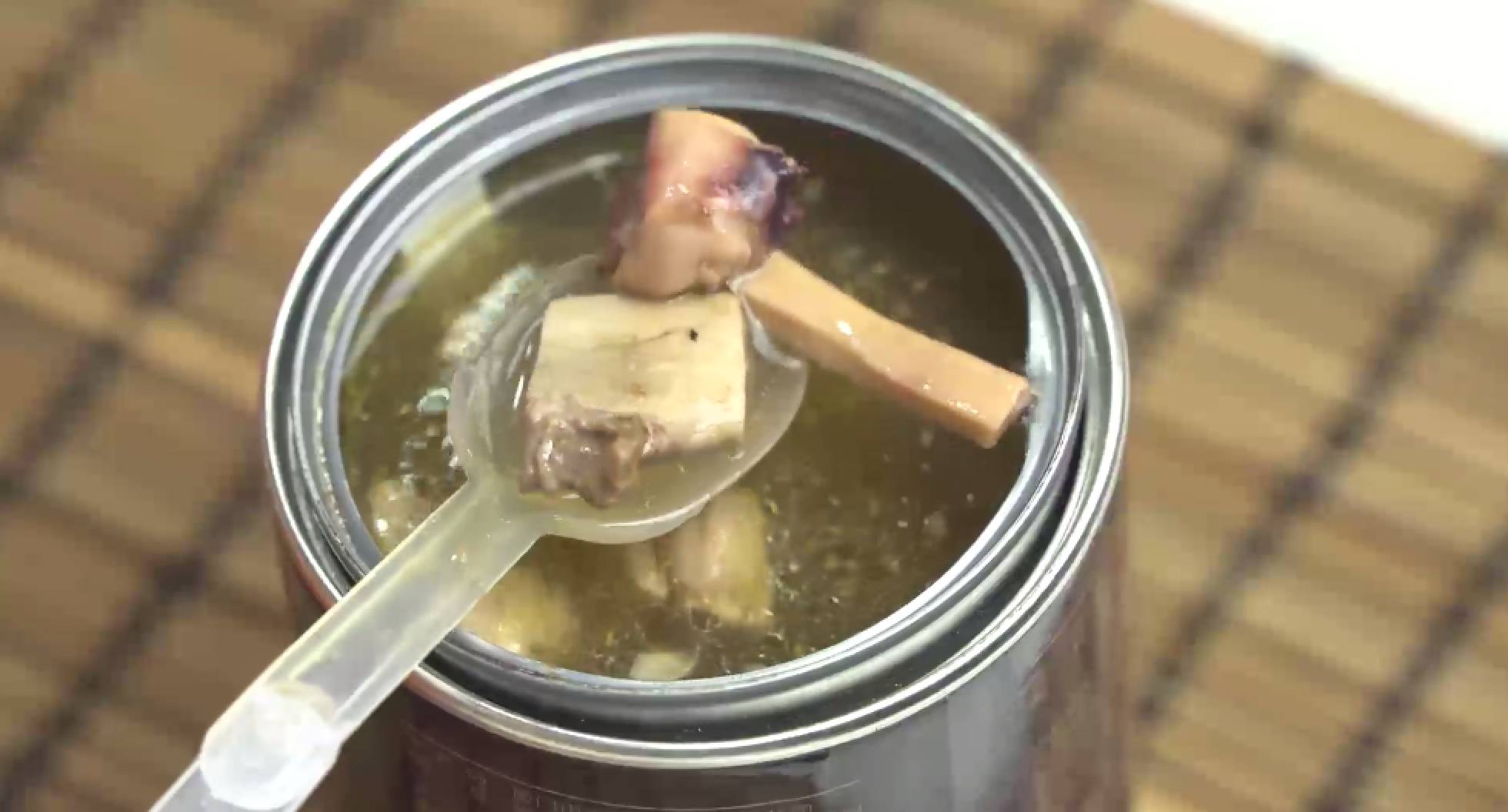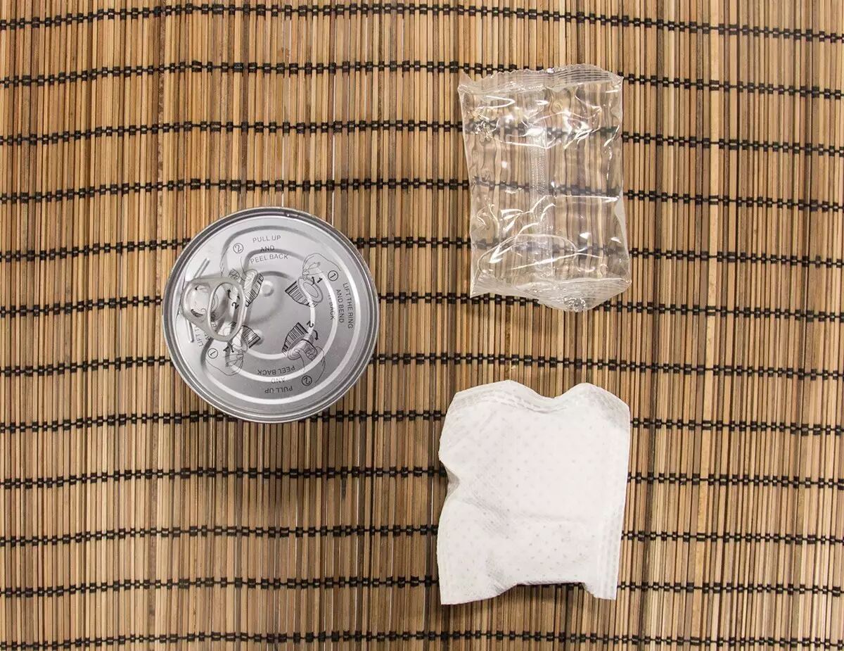 制作过程:将自热包置于罐头底层;将纯净水包倒入罐头底层;拉开罐头包装置于加热包上方;盖上盖子等待加热完成。