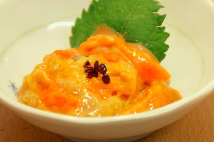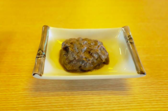 鱼类之外的海鲜也能拿来做盐辛,像乌贼盐辛在腌的时候还会加入墨囊,做出来黑乎乎的盐辛叫做黒づくり。九州一带有种特产是把小螃蟹砸碎了腌,倒是和我们的虾酱有异曲同工之处。而海参肠子做成的盐辛——海鼠肠甚至和海胆、乌鱼子一起并称为日本三大珍味。在海鼠肠里加进海鞘做的盐辛叫做莫久来,有说法是因为海鞘味道太鲜了好像爆弹在口中炸开,于是就起了在日语中谐音的莫久来一名。