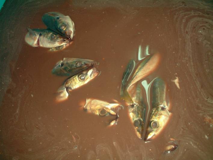 臭鱼干本身并没有经过特别充分的发酵,发酵的过程发生在臭鱼液里,臭鱼液最初,注意是最初,是用鱼肉和内脏在浓盐水中发酵得到的。如同我们这边老酒窖和酱肉老汤一般,现在制作臭鱼干的老店中使用的臭鱼液很多都已经有了百年以上的历史,臭味之强烈甚至可以从照片中感受一二。同一缸臭鱼液还不能连续使用,用过几次以后就需要让其中的微生物休几天假,如果实在需要它们加班,就得多切点新鲜鱼肉丢进去补充营养。各家店使用的臭鱼液中的微生物组成并不完全一致,这也成了各家臭鱼干独特味道的来源,这些繁衍了百年的单细胞小厨师用它们的代谢产物给自己的作品打上了独一无二的商标,缺点就是……好臭呀。
