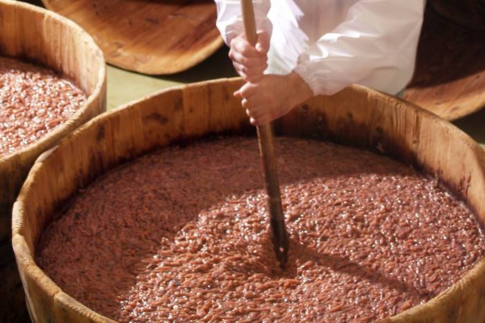 大家熟悉的寿司其实也起源于发酵保存的鱼,最早的寿司是把鱼肉加盐保存在米饭里,利用微生物分解米饭中的糖类释放出的乳酸来抑制杂菌生长,达到延长鱼肉保质期的效果。古代的寿司其实是去掉米饭吃腌鱼的,后来发展出鱼和饭一起吃,现在流行的握寿司是江户时代才出现的,用的米饭虽然不必再发酵了,不过里面还是会放醋。