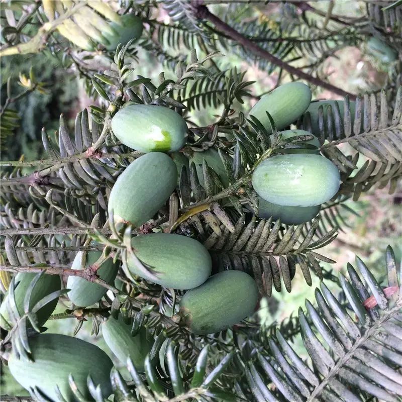 裸子植物中除了松子,还有一种植物的种子也被炒熟了当零食吃,它就是榧Torreyagrandis的一个变种——香榧Torreyagrandis Fort. var.merrillii,虽然叶子长得有点像松柏,但它却是三尖杉科的植物。现在用来吃的香榧主要产在我国浙江,都是唐代以后把自然变异植株利用嫁接等无性繁殖技术培育出的,比普通榧树的种子香脆味美。香榧树从长出球花到种子成熟需要三年,所以一棵树上的种子既有成熟的也有未成熟的,人们在采收时候只能爬到高高的树顶去人工挑选采摘,摘回来后需要去掉肉质有毒的假种皮,留下种子炒熟,破开硬质的外种皮后还不能马上吃,要仔细去掉苦味的褐色内种皮才能吃到好吃的胚乳,对于我这种吃螃蟹都嫌麻烦的人,实在是一种不友好的食物。(所长个人觉得这个东西味道有点怪)