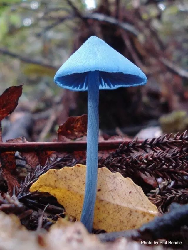它是谁?它是粉褶菌属的霍氏粉褶菌(Entoloma hochstetteri)。这种蘑菇的菌盖最大约5cm,但菌柄很细,只有约5mm直径,名副其实又蓝又瘦。