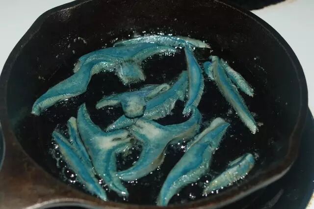 正在接受油锅审判的靛蓝乳菇,看起来好像牛肝菌切片。图片:staticflickr.com