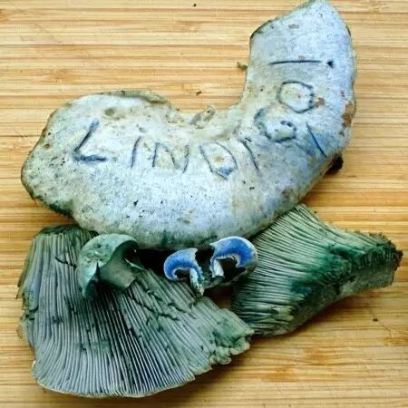 吃货们来说,“蓝瘦香菇”的“瘦”会让人大失所望,不过这世界总是公平的,有瘦的就有胖的,有不能吃的就会有美味的。好消息是,有一种同样拥有惊艳的蓝色,但却肥肥的、肉质的,最重要的是,可食用的“蓝胖香菇”——乳菇属的靛蓝乳菇(Lactarius indigo),又叫作蓝绿乳菇。