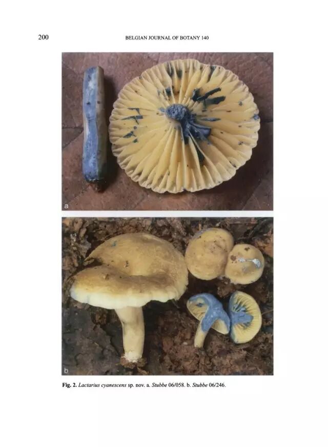同样能伤后流出蓝色乳汁的Lactarius cyanescens。图片:论文Stubbe D, Verbeken A, Watling R. Blue-staining species of Lactarius subgenus Plinthogali in Malaysia. Belgian Journal of Botany, 2007, 140(2): 197-212.