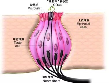我们的舌头是味觉接收器(taste receptors)聚集地,不同的味觉化学物质被接收后,产生信号传递到大脑。这条通路的前提是:味道分子激活味觉细胞上的味道接收器。油脂分子也由它的特殊接收器(CD36, GPCR和DRK)处理和加工。有研究证明,油脂分子能迅速被舌头上的接受器捕捉并迅速通知大脑准备吸收和消化脂肪。还有研究认为,我们的舌头上有一种酶,叫做舌脂酶(Lingual lipase),它将甘油三酯分解成脂肪酸,而后者更容易被味觉细胞捕捉。但舌脂酶的浓度和活性到底如何,能否迅速将我们咀嚼食物中的脂肪酸释放出来,及其脂肪酶抑制剂(Orlistat)对其味觉阈的营养还有待进一步的研究。
