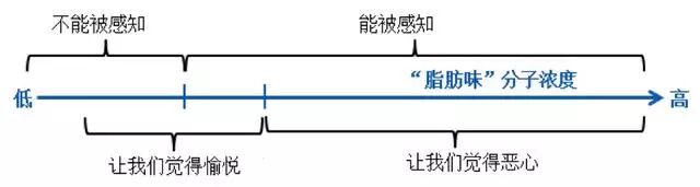 那么油脂味呢?科学家们认为,过多的脂肪酸意味着腐坏的食物。所以当未酯化脂肪酸的浓度超过某一个数值时(因人而异),就会让人明显产生恶心反感的感觉。且当浓度更高时,人口腔对质地的感受及嗅觉也参与其中。食品工业很早就意识到人们对脂肪酸本身味道的抵触,将加工食品中油脂的味道刻意降低到0.1-3%,低于人类感知的水平,或通过特殊方法将它们酯化。