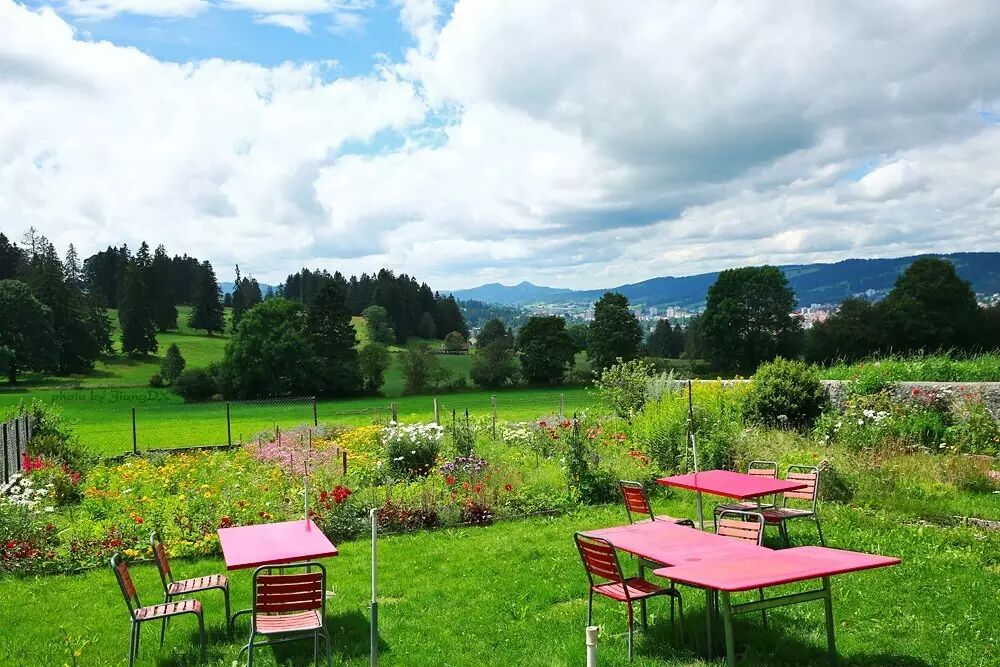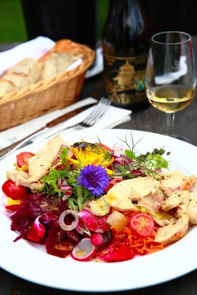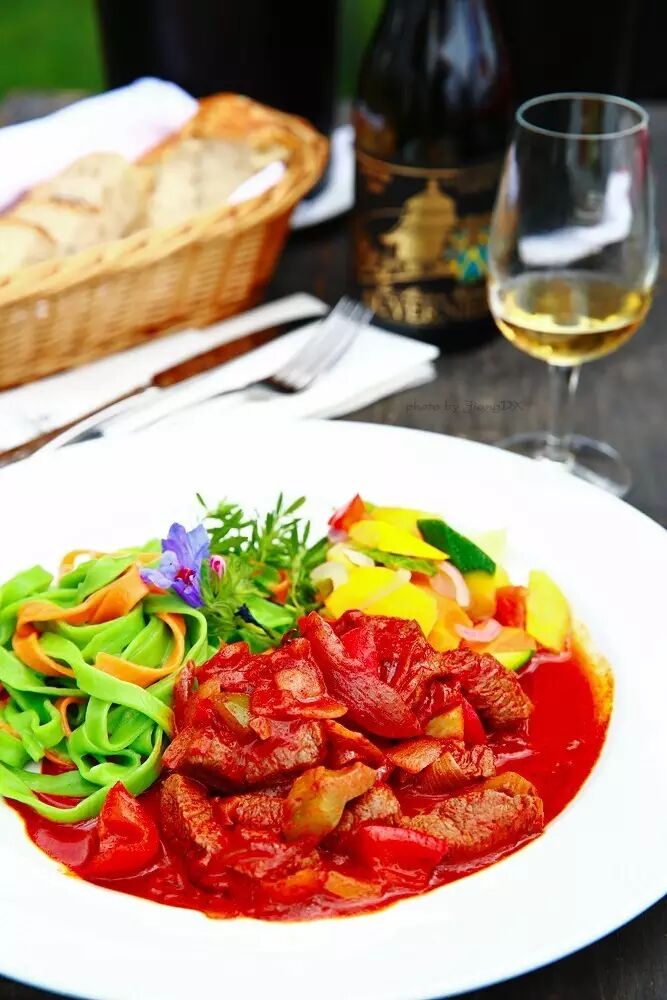 这两张图拍自瑞士钟表谷,当时天气很好,室外阳光充足,微晒但多云,只要云一过来挡住阳光直射,明亮而又柔和的光线就是最适合拍美食的光线了。在这种明亮的柔光环境下,只要保证被摄体曝光合适,那么清晰度和色彩都不是问题。这份鲜花杂菜鸡肉沙拉和这份番茄牛肉配双味宽面都是卖相很丰富的菜品,无论造型还是色彩都很丰富,虽然杂乱,但是并不丑。这样东西本身的卖相是没问题了,只是由于主体过于复杂,那么如果背景桌面很空的话,主体会显得很突兀,这样就利用桌上其他的东西充当道具,餐前包、刀叉纸巾、酒、酒杯、冰桶这些东西来做一下后景搭配,让后部空间也复杂起来,这样就可以平衡画面,让整个画面看起来更为协调。