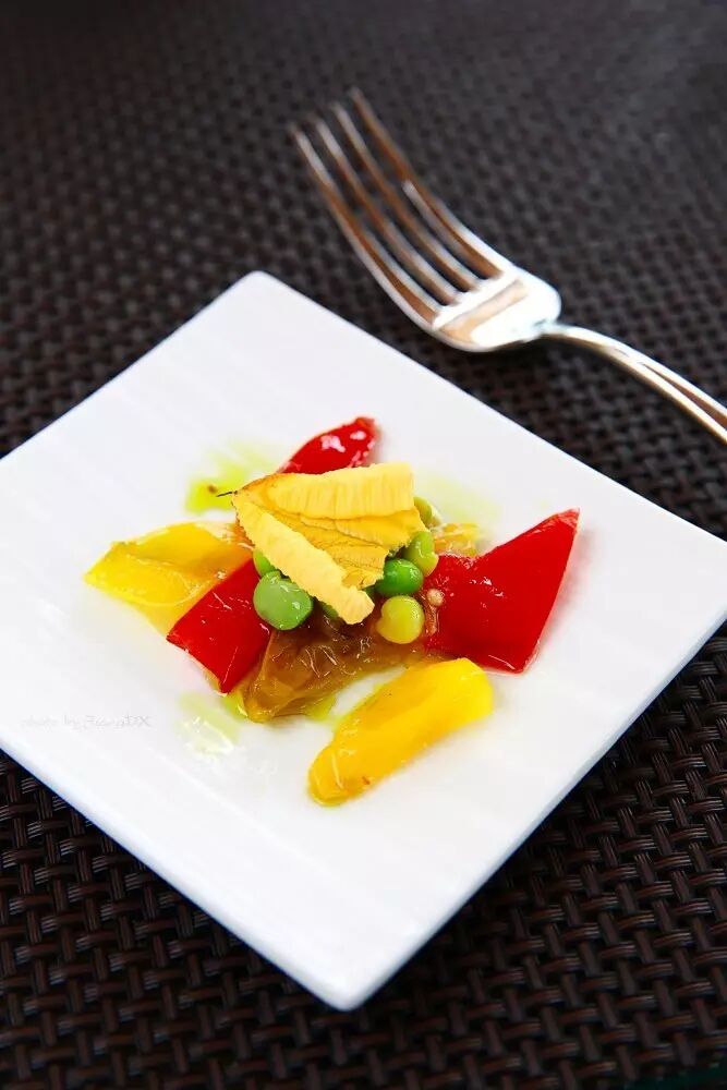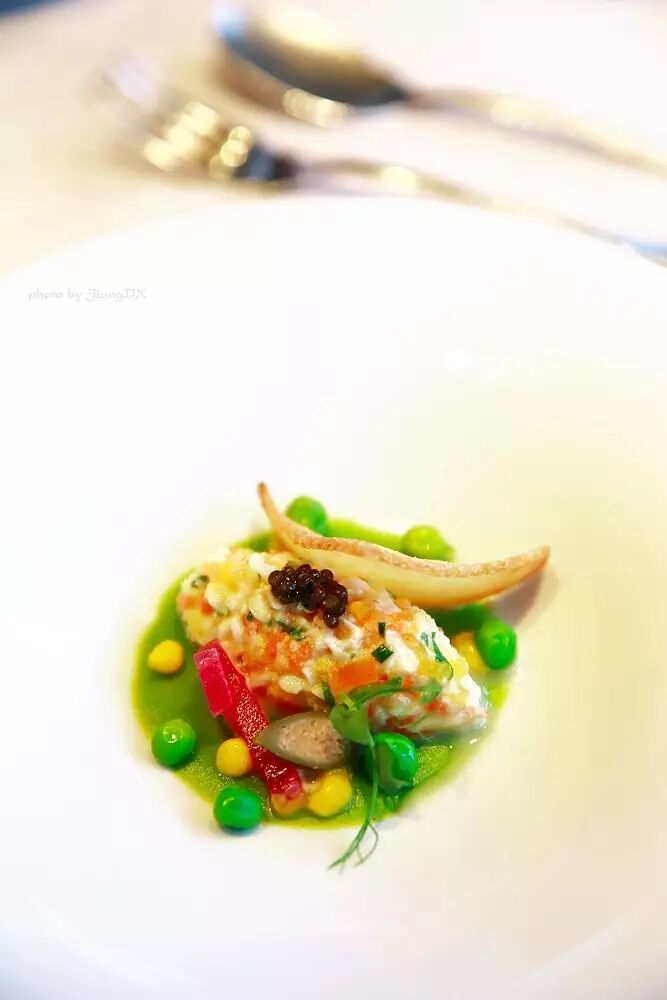 即便卖相好,光线不足,也是很大的问题。下面这道菜是巴黎埃菲尔铁塔上面的Le Jules Verne餐厅的出品,有很多的这种高档餐厅晚餐时段光线都很暗,高档餐厅又都爱用大容器盛小份量的菜品,所以就餐时是很难直接拍好看的。如果有出境摘星的美食计划,那最好是想拍的餐厅安排在午餐时段,要求餐厅给预定安排在有柔和充足的自然光的位置,这样比较好记录。如果是晚餐时段,餐厅光线又很暗,那尝试一下不好拍的话就放弃拍摄好好吃为好,毕竟在高档餐厅里是很讲究就餐体验的,你也没法让同行人开着手机手电筒帮你照亮,何况那样效果也未必就好。
