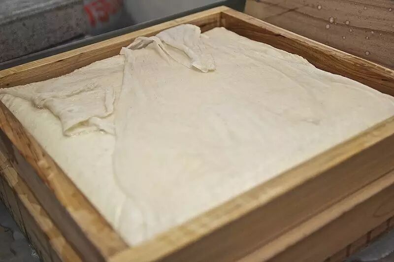 用布包起来挤掉豆腐中的水分。 图:gandan.me