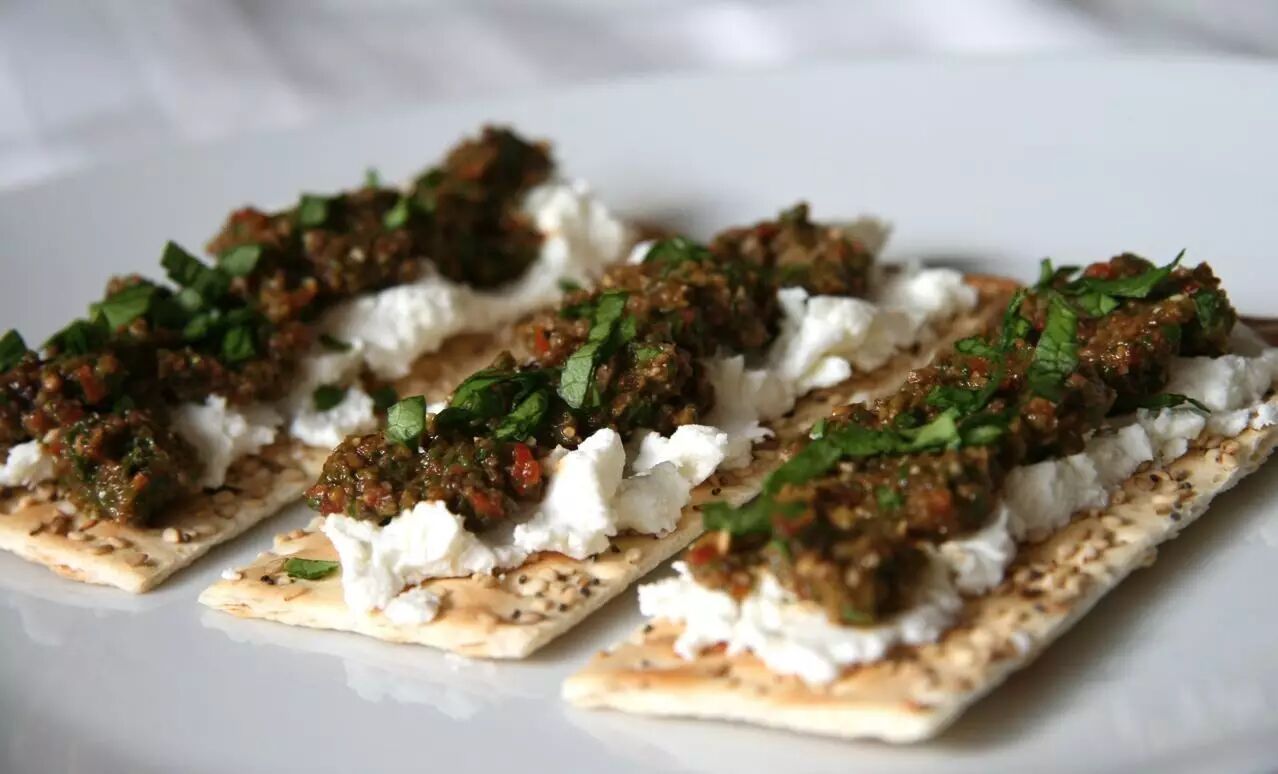 小薄饼配芝麻酱、番茄酱和乌榄酱。 图: