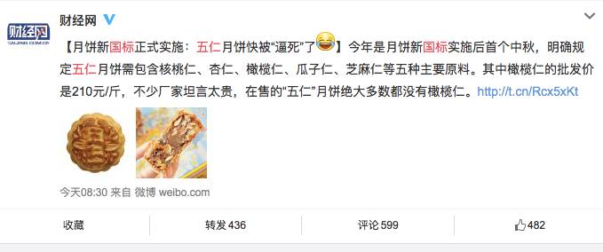 最后再说国标的问题,在这次引起关注的GB/T 19855-2015(月饼新国标)中,其中广式月饼条目中的4.2.1.3果仁类的标准里,确实提到了“馅料中果仁含量的质量分数应不低于20%,其中使用核桃仁、杏仁、橄榄仁、瓜子仁、芝麻仁等五种主要原料加工成馅的月饼可称为五仁月饼。”