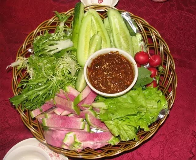 更有名的是蘸酱菜,菜要新鲜水灵的时令菜,酱要新、味要醇。春天和初夏多是山野菜,蒲公英、小根蒜、刺嫩芽、蕨菜、柳蒿芽;盛夏的生菜、小白菜、黄瓜、水萝卜、辣椒、小葱;秋冬的酸菜心儿、大萝卜、白菜心儿、大葱,还有四季均出镜的大豆腐和干豆腐。酱可以是纯大酱,也可以是大酱炒的鸡蛋酱或肉酱。