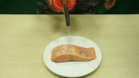 加热后取出食材,后续简单调味加工即可。果壳实验室没有专业厨具,就用喷火枪喷烤食材表面,使表面焦化,食材散发香味,提升口感,并能锁住其内部水分,最后再撒料摆盘。如果家里有条件的,可以用锅煎烤几分钟,也可以起到同样效果。
