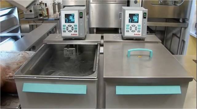 国外餐厅有类似的设备,其实是一个大锅,承载量更大,而且使用时间更长,会有盖子。因为会有很多肉的料理,比如需要慢炖七十二个小时的东西,敞盖的东西显然没有办法做到,水没了再补水温度又达不到,带盖就能让锅始终保持一个温度。慢炖的最终目的还是让核心达到温度,但加工时间不同,对蛋白分解的量不同,到后面肉会变得更容易拆下来,三个小时的牛肉显然比一个小时的肉更烂一些。同样的道理,温度低,料理时间就更长,需要蛋白充分分解,让汁水更丰富,就需要一个长时间的加工,那是专业厨房用的东西,和这个显然不一样,这个是给家庭用的。