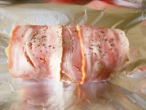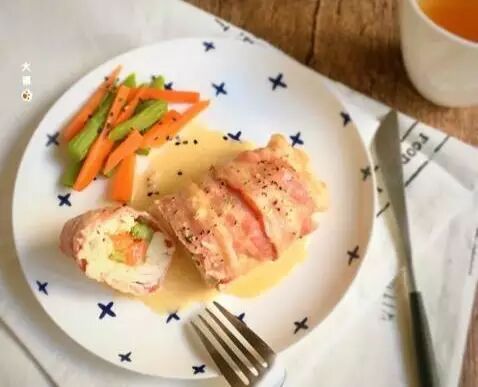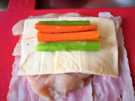 烤前准备:将鸡胸片成0.5厘米薄片,面上放一片芝士片,再码上芦笋和胡萝卜条,轻轻卷起来,然后外层再裹上培根片,最后以锡箔纸卷好。步骤如图: