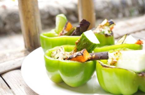 做法:同样也是一道烤菜。特别要使用青椒的原因是,这货稍稍烤过之后,特别清甜。将长茄、胡萝卜切段,青椒横切,刷油后放置烤盘上烤透。然后将烤茄、烤胡萝卜、生黄瓜段或是生菜一同放入烤椒盅里,淋上芝麻风味酱汁。这道沙拉请用手举着慢慢吃,特别优雅。