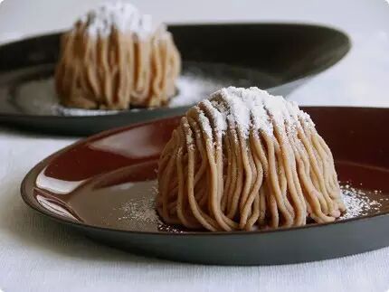 蒙布朗是经典的法式甜点,柔滑的糖渍栗子泥包裹着蛋白糖饼和栗子奶油馅,有时在顶端点缀雪白的糖粉或一颗栗子,堆砌而成的样子像极了终年积雪的山峰,人们便以阿尔卑斯山的最高峰勃朗峰(Mont Blanc)为其命名。