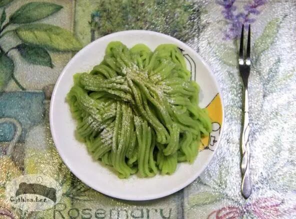 最后是组装,抹茶蛋糕切成合适的大小,表层涂抹牛油果泥,将毛豆泥至于裱花袋中,将其挤出覆盖在表面,最后撒上糖粉就大功告成!
