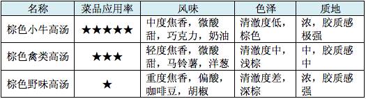 棕色高汤:棕褐色——复杂焦香(优),浅棕色——焦香不足(劣),黑褐色——焦苦味(劣)