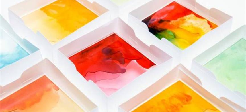 以下的图片是西班牙艺术家MartaYebra和Imanol Elósegui的作品:把小熊糖加热成液态倒在一个白画框一样的纸盒里,是不是就像是一组颜色清丽抽象画?