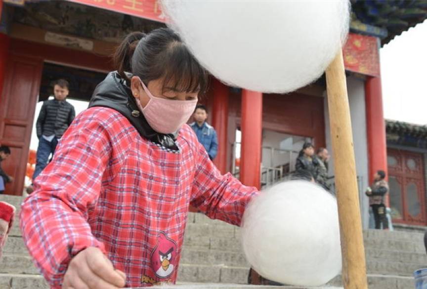 这种大朵的丝状棉花糖,最早可以追溯到15世纪的意大利贵族,当时点心师将加热融化的砂糖快速搅拌拉出糖丝缠绕在棒子上吃。我们所熟悉的棉花糖机,是用机器轴旋转喷出融化的糖浆,糖迅速冷却为糖丝,绕在木棒上,就做出了棉花糖。这个机器在1904年世博会由美国的两位发明家改进,大大简化了棉花糖工艺,棉花糖也就成为了普通百姓也吃的到的街头零食。