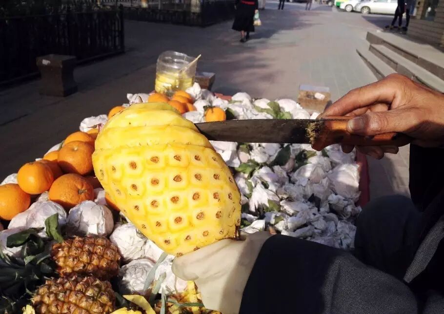 但是这种小摊上买的菠萝,在吃之前,一般还需要泡盐水。而且,比如所长这种洁癖(excuseme?所长居然有洁癖!)就会嫌弃小贩的刀脏,塑料袋脏,切的时候会被路边的风沙污染等等