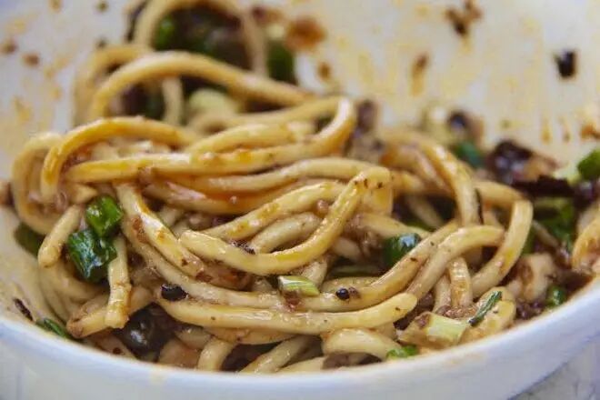 不光是菜肴,主食小吃也可以做成怪味的。成都的怪味面是当地一绝,分为底碗调料和汤汁调料。底碗是用香油、花椒粉、味精、糖、盐、醋、红油等制作的怪味底料,汤汁是用猪骨、海米和墨鱼等海鲜放鸡汤里炖好的,面条出锅,盛进底料碗中,再浇上汤汁。一碗面,海鲜的清香加上麻辣酸甜融合而成了怪味。