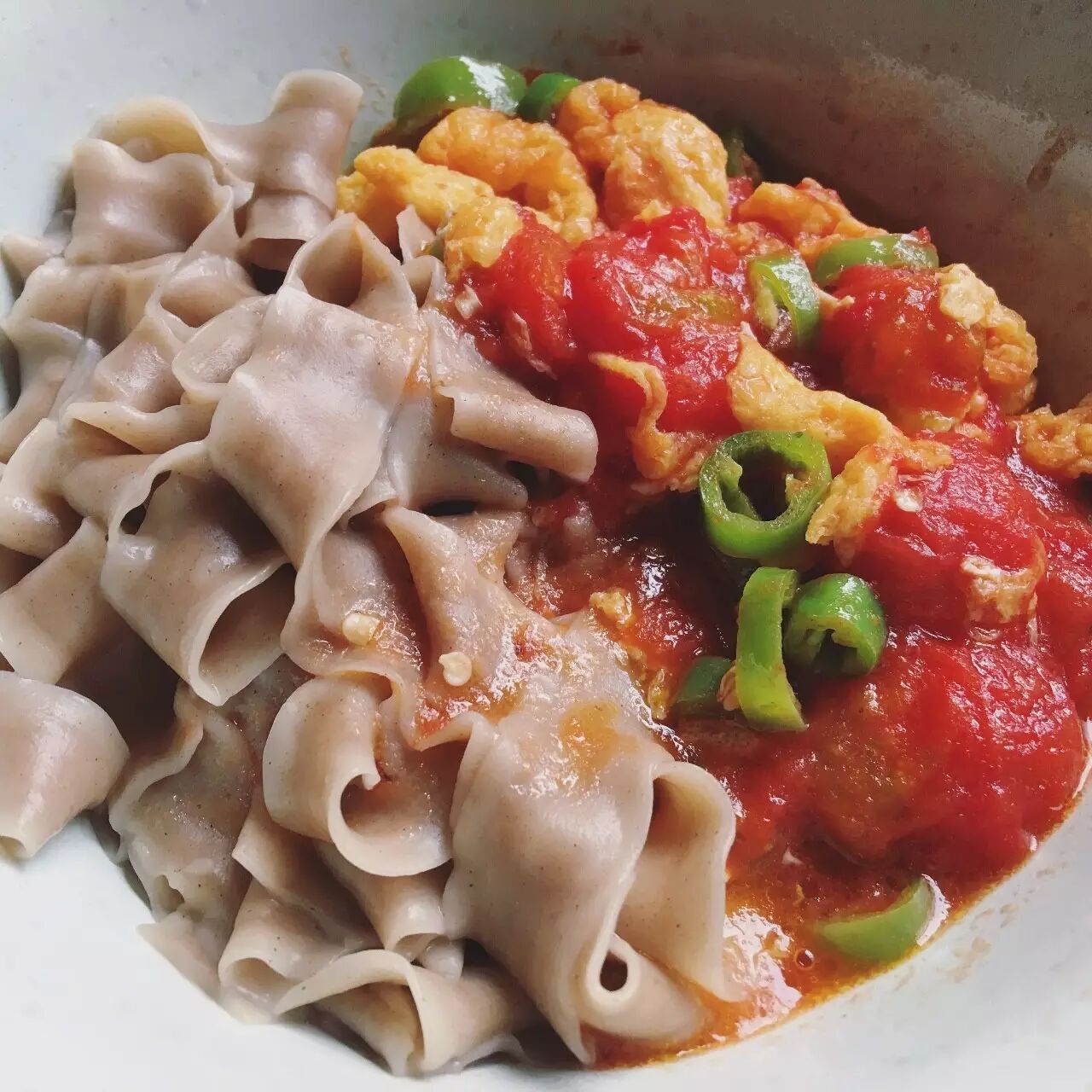 做西红柿打卤面时,用圣女果(小西红柿)烫掉外皮,和鸡蛋一起做卤,风味更浓郁。