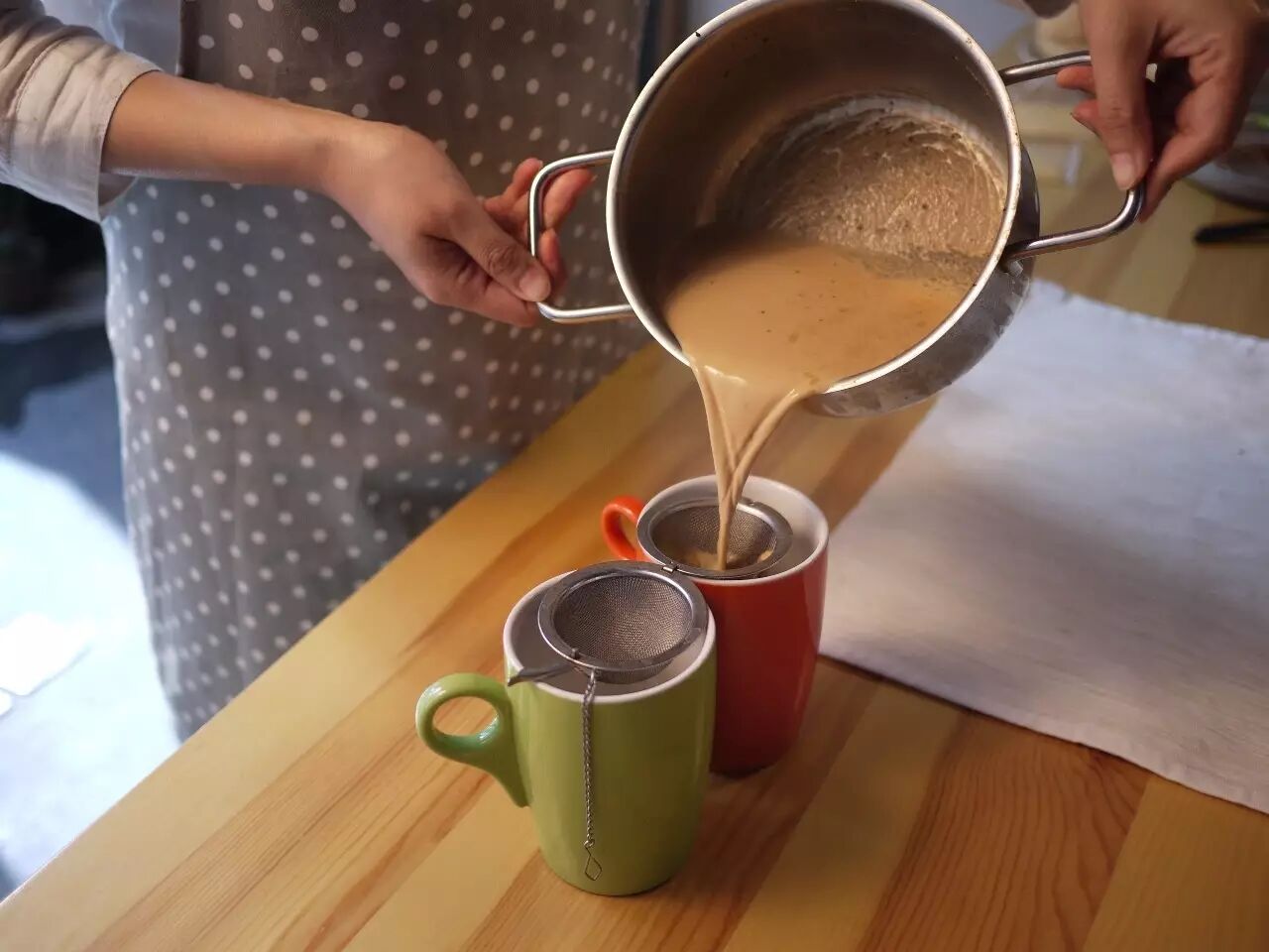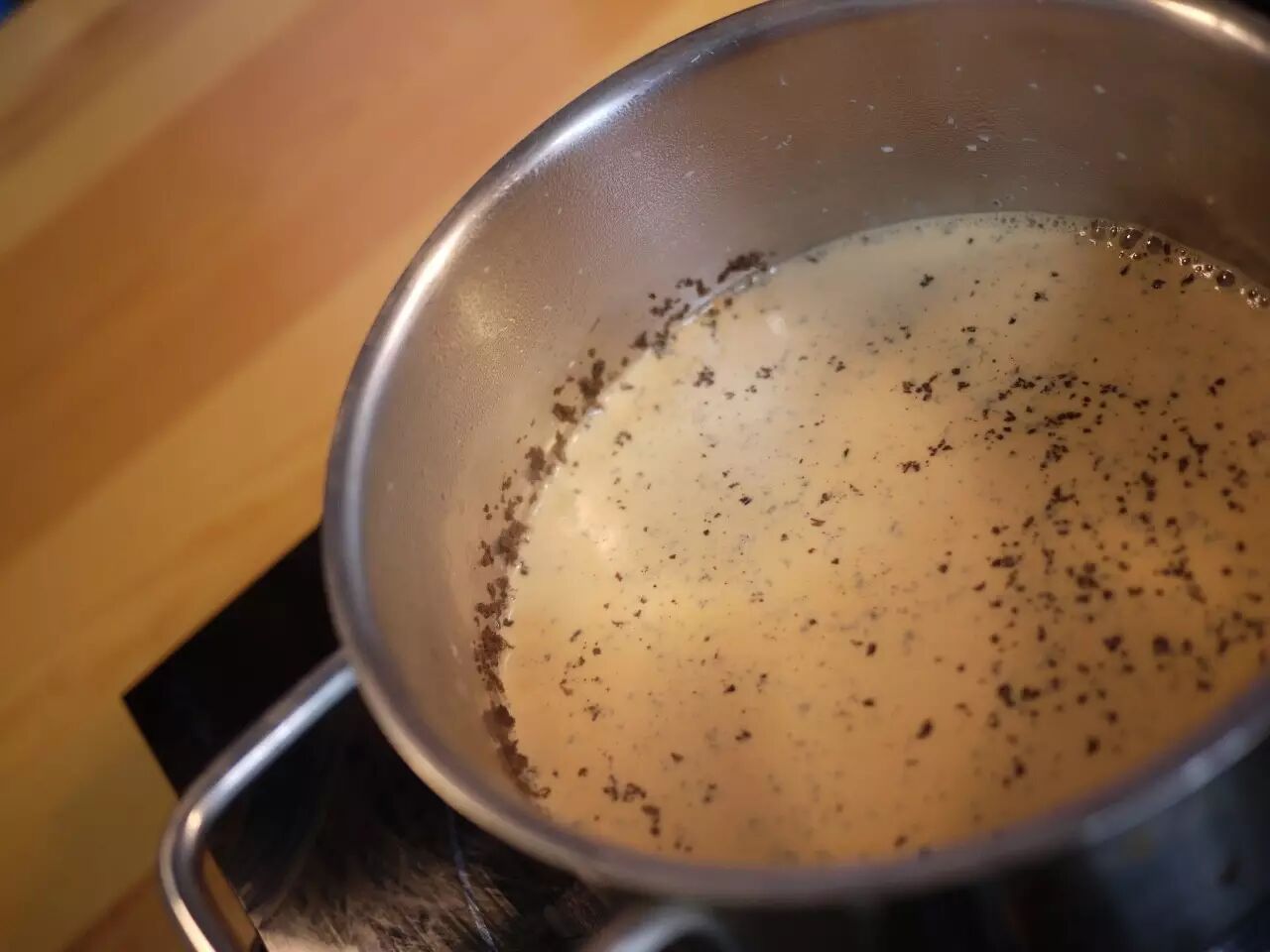 锅中放入细碎的红茶,倒入开水没过红茶后再一次充分煮开,然后倒入牛奶,再煮开即是浓郁的奶茶。