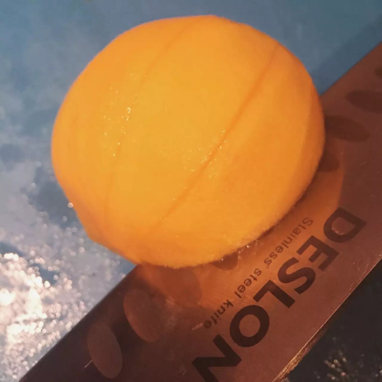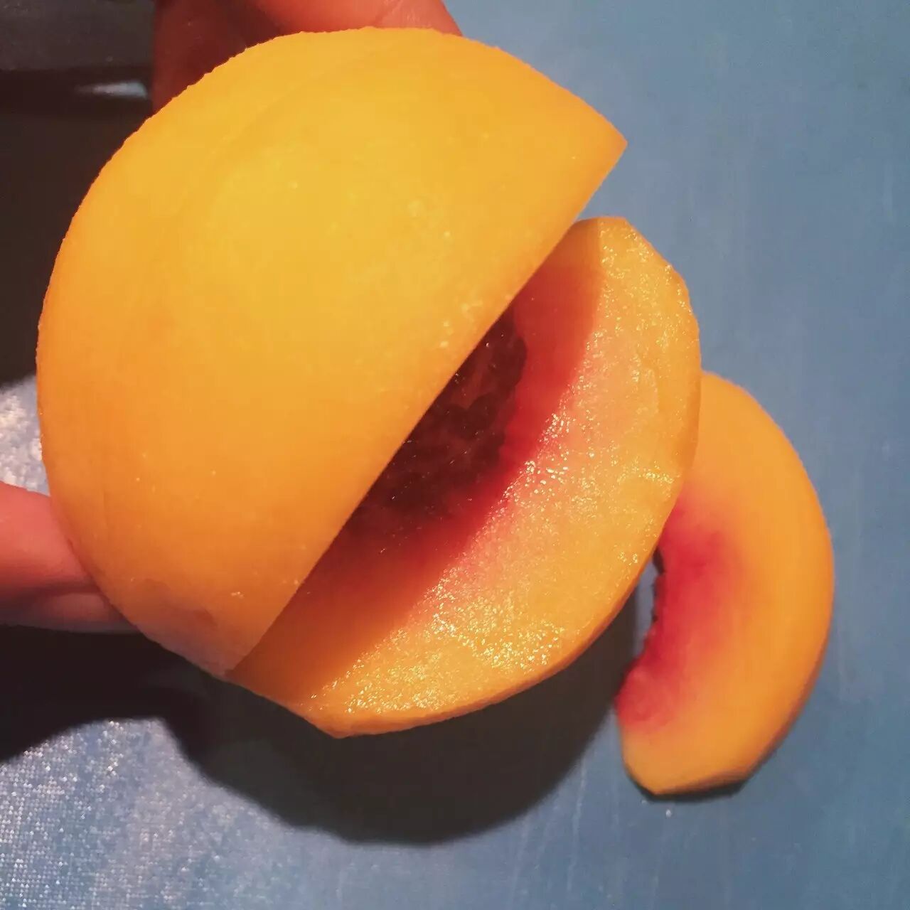 不离核的黄桃想自制罐头,就用刀从桃每一个角度都切一刀到核,不用太使劲就能一片片揪下来了。