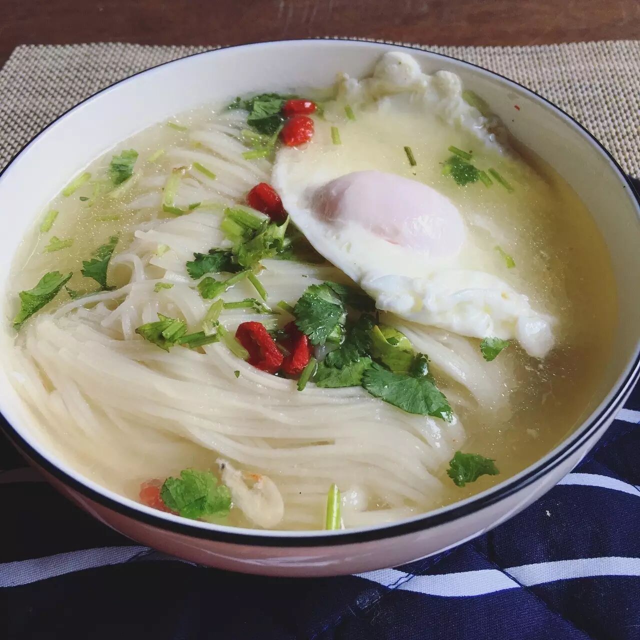 鸡蛋稍微煎一下定型后再放入面里,不但面汤有炝锅面的香气,鸡蛋也不会散落在面里。