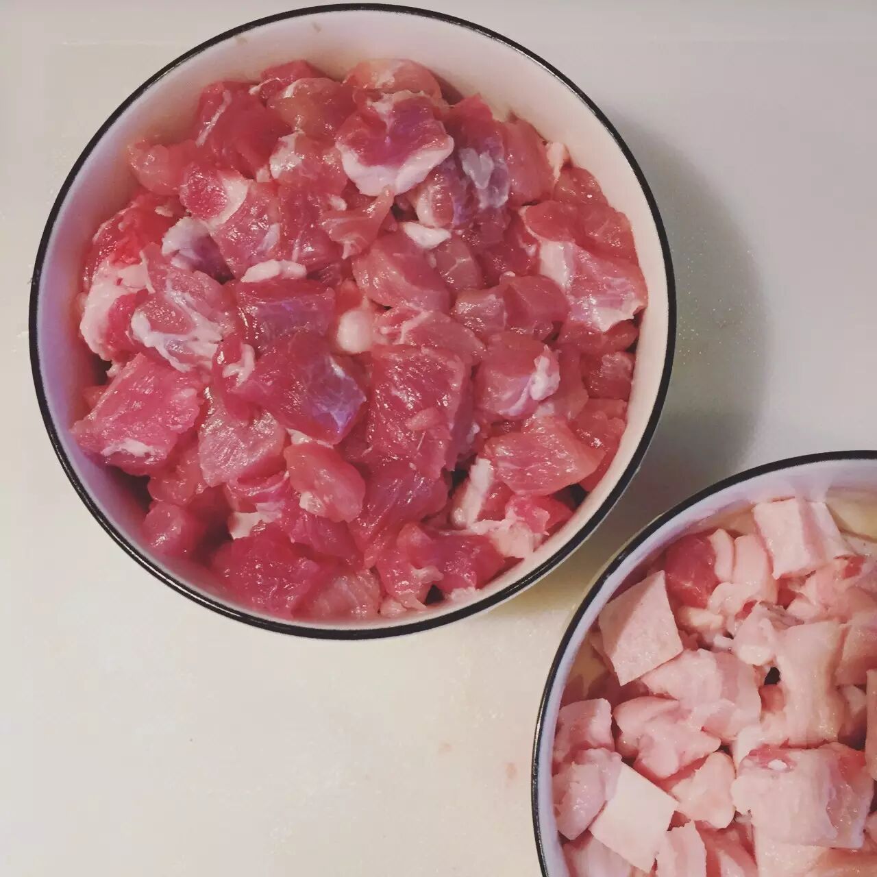 五花肉肥瘦分开切丁,先煸炒肥肉,出油后再与瘦肉一起煸炒,这样肥肉不腻,瘦肉不柴。