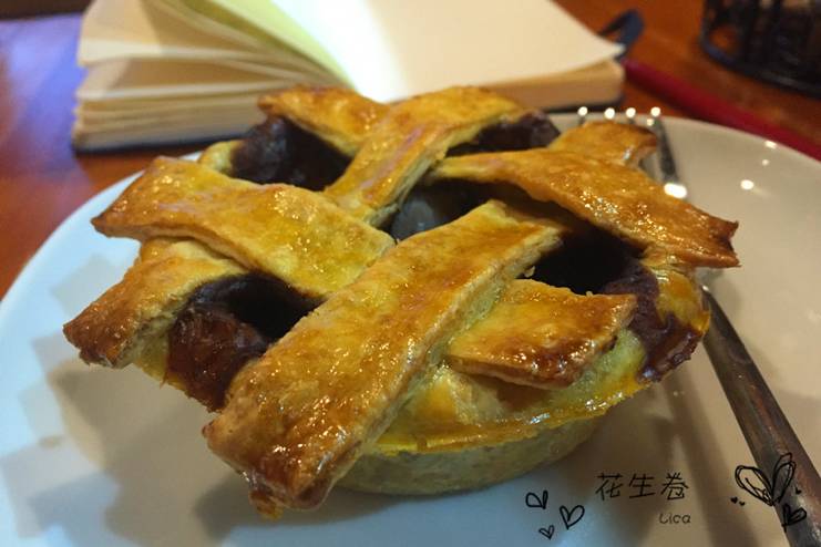 看到这个派忍不住说一下派皮和挞皮的区别,同样是pastry,但是派皮有水,有黄油,有糖,酥松。挞皮用蛋,用黄油,酥脆。挞皮普遍是比派皮硬的,这里用的更像是挞皮,又或者说是一个制作的不太成功的派皮。