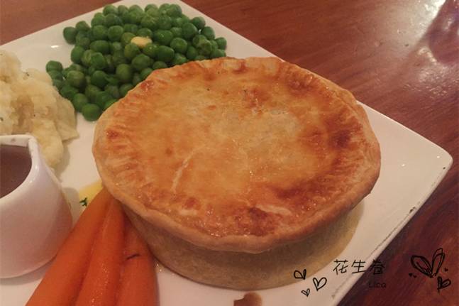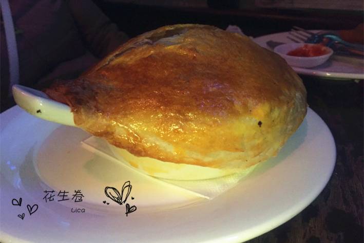 派皮:标准的英式派皮,完整的千层酥皮。质地略油,偏软,有点像黄桥烧饼的酥皮。可能由于黄油多所以很香,吃起来满足感很高。