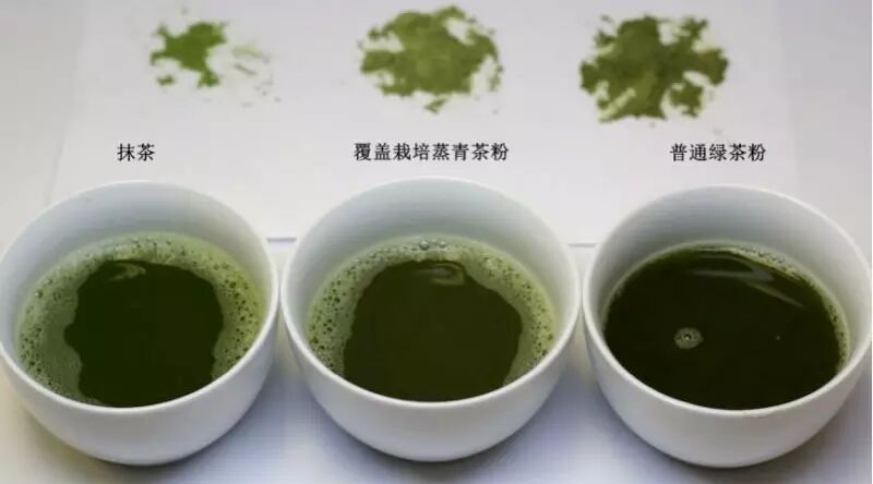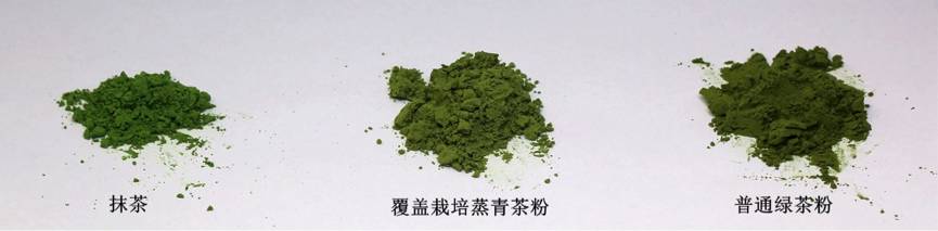 对比三个样品,可以发现真正的抹茶粉由于叶片中叶绿素含量高并且在加工当中去除了叶柄叶脉等杂质而明显颜色鲜艳翠绿,覆盖栽培蒸青茶粉绿色浅且略带黄色,而普通绿茶粉则是带着暗黄的墨绿色。