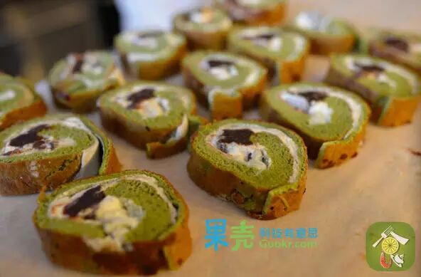 4)鲜奶油和糖打发,加入抹茶粉,将鲜奶油、红蜜豆涂抹在蛋糕片上,起始端涂满,收尾端奶油薄,最后2-3cm不涂奶油;