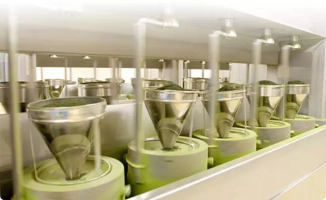 图:aiya-america.com。现代化抹茶生产中的石磨研磨加工