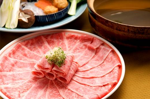 牛肉料理,怎么能少的了上好的牛肉,最佳选择当然是日本和牛。和牛脂肪分布细致均匀,稍加炙烤后入口即化,但脂含量略高,虽然口感嫩滑吃多了难免觉得有些肥腻,加之上好的和牛做炭烤时通常厚切,如果食客火候掌握不好实在是暴殄天物。寿喜烧里的牛肉一般都切的很薄,稍稍烫烤就可以吃,选用以肉质见长的和牛再合适不过,搭配蔬菜同食也不会觉得油腻。