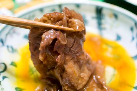 无论是关西派还是关东派,吃牛肉时都会蘸上新鲜的鸡蛋液,因为刚刚出锅的牛肉很烫,裹挟着蛋液降温后更方便入口,另外,爽滑鲜美的蛋液还能激发牛肉更丰富的口感。最后加入能吸收汤汁的乌冬面收尾。